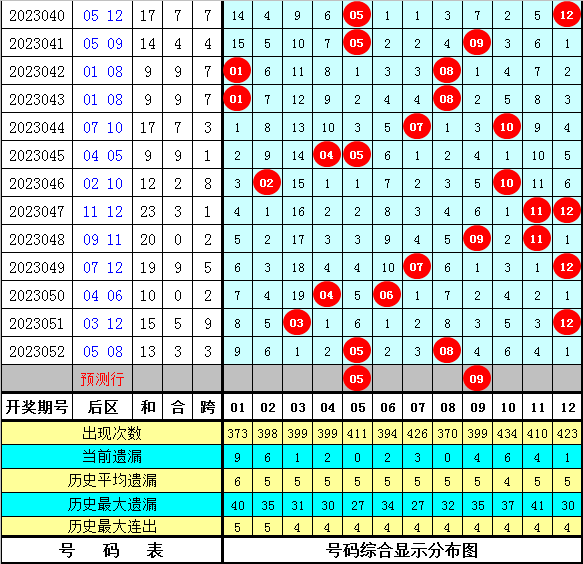 后区分析:后区上期开出奖号05+08,为全2路组合,最近10期后区号码012路比为6:7:7,其中号码02出现3个,号码03、07出现2个,号码08、10出现1个,号码01、04、05、06、09、11、12没有出现。本期看好后区在01、03、05、08、09、11之中落号。