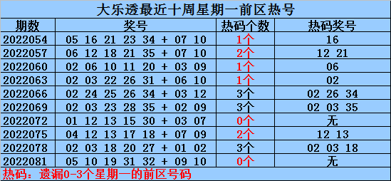 热号:最近十周星期一前区开出16个热号,上周星期一前区开出0个热号,本期预计热号继续火爆,关注号码02 18 19。
