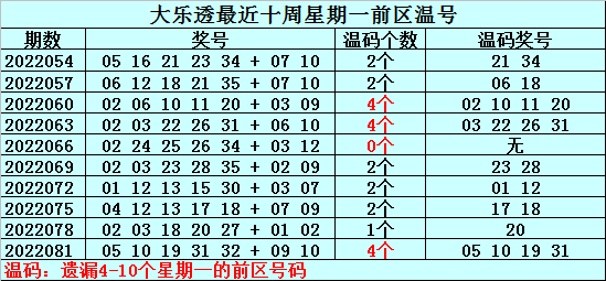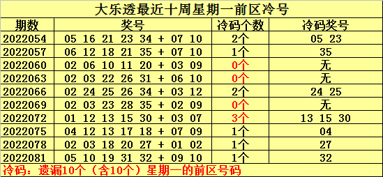 冷号:最近十周星期一前区开出11个冷号,上周星期一冷号出现1个,本周星期一放弃冷号出现的可能。