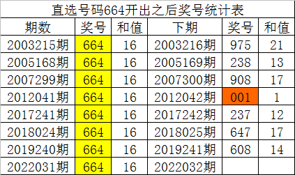 从以上统计可以看出,直选号码664出现之后,其下期奖号:1。下期0路号码出现概率100%;