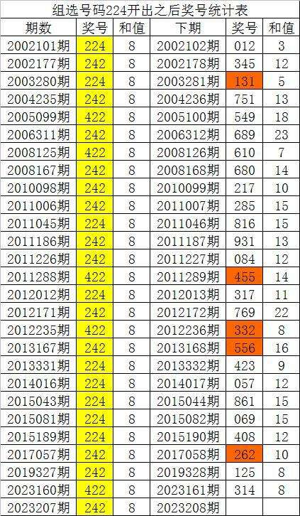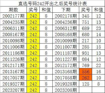 从以上统计可以看出,直选号码242出现之后,其下期奖号:1。下期大号出现概率100%;