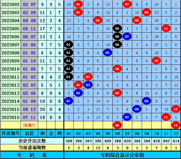 后区分析:后区上期开出1路+2路奖号07和11,最近20期后区0路奖号开出15个,1路奖号出现13个,2路奖号出现12个,最近8期后区0路奖号出现6个,1路奖号出现6个,2路奖号出现4个,本期后区注意号码:01、05、06、09、12,单挑两码组合06+12。