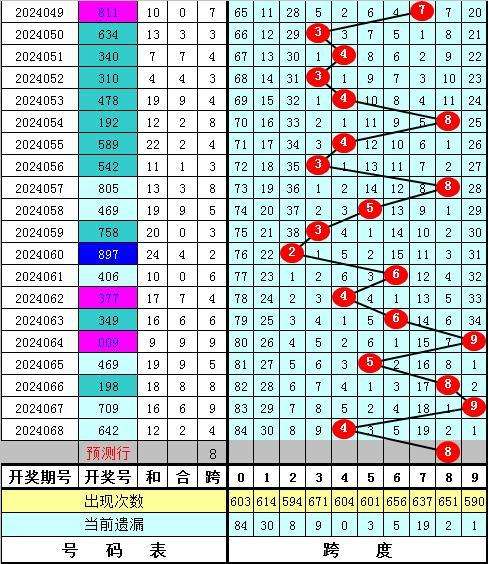 福彩3D第2024068期最大跨度开出4,近期最大跨度波动较大,本期预计最大跨度在5-9区段开出,最大跨度参考6789,一码跨度参考8。
