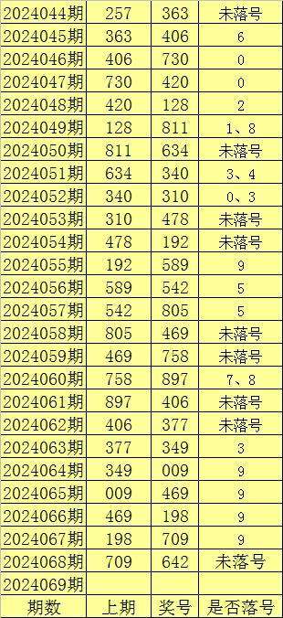 福彩3D第2024068奖号642,重号未落号。在最近100期(第2023320期-2024068期)中,重号落号59期;最近20期重号落号概率为60%;最近10期重号落号概率为60%。本期防重号中号码轮空。