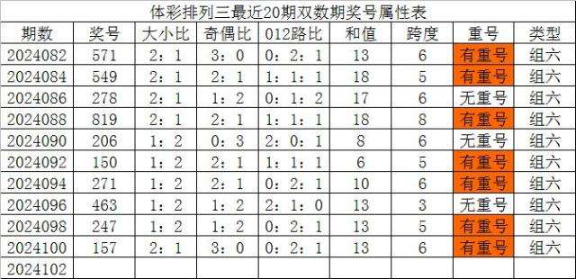 体彩排列三最近20期双数期奖号分别为:571、549、278、819、206、150、271、463、247、157,各期奖号详细属性下表: