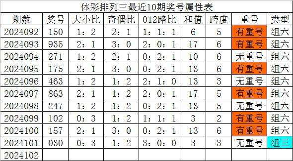 体彩排列三最近10期分别开出奖号:150、935、271、175、463、863、247、102、157、030,各奖号属性详见下表: