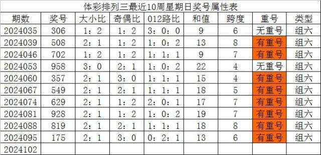 体彩排列三最近10周星期日奖号分别为:306、508、702、958、357、549、629、928、819、175,各奖号属性详见下表: