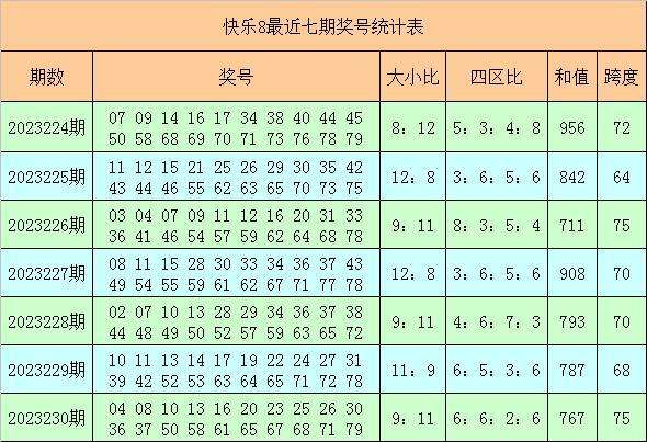 福彩快乐8第2023230期开出奖号:04 08 10 13 16 20 23 25 26 30 36 37 50 58 61 65 67 68 71 79,其中奖号大小比为8:12,四区比为6:6:2:6,和值为767,跨度为75。