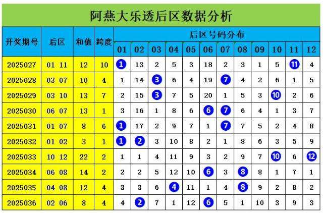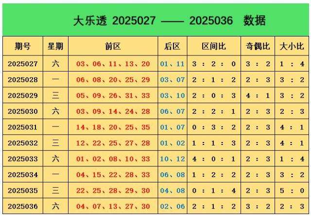 上期回顾:大乐透第2025036期奖号为:前区04、07、13、27、30 ,后区02、06,前区奖号三区比为2:1:2,奇偶比为3:2,大小比为2:3,后区开出小小组合02、06