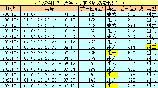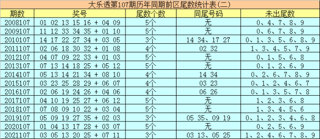大乐透历年同期第107期后区尾数奇偶比为15:13,最近5年尾数奇偶比为6:4,后区尾数大小比为11:17,最近5年尾数大小比为3:7,本期后区注意号码02、03、06、08、10,后区两码关注02、10。