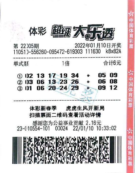 1月10日,体彩大乐透第22005期开出前区号码02、13、17、19、34,后区号码05、09。当期全国开出16注一等奖。其中3注为追加投注一等奖,单注奖金1129。5万元(含追加投注奖金502万元);13注为基本投注一等奖,单注奖金627。5万元。四川省成都市都江堰5123010554体彩店一位幸运购彩者命中基本投注一等奖1注。