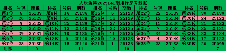 超级大乐透前区是从01-35的号码中每期开出5个号码,以当前最大遗漏期数做为统计数据,把历史数据按照出现次数排行后分成五个区,每个区7个号码,前二位的号码是热位号,中三位的号码是温位号,后二位的号码是冷位号,理论上每个区每期是开1个号码,对比最近开出的数据分析: