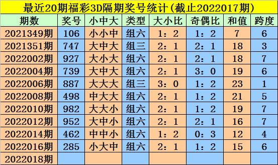 跨度:跨度近期出现在3-8之间,振幅较大,上期开出跨度6,跨度重复热出,本期看好跨度走低,关注跨度5。