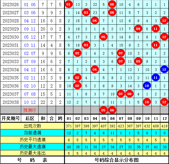 后区第二位:上期奖号为12,开出0路号码,最近10期0路号码出现4次,出现次数与理论相当,本期注意0路号码继续开出,参考06。