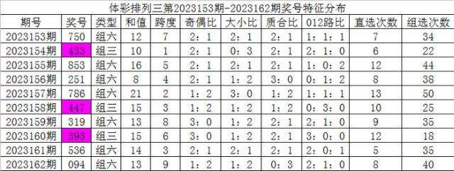 开奖公告:体彩排列三第2023162期开出奖号:094。组六,无重号,奇偶比1:2,大小比1:2,012比2:1:0,和值13,跨度9。