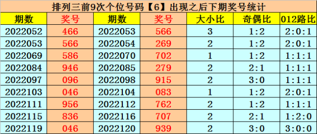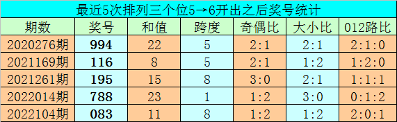1、排列三前两期个位分别开出号码5和6,历史上个位号码连续两期分别出现5和6时,共有49次。在最近5次出现时,其下期分别出现号码:994、116、195、788、083;