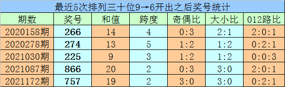 1、最近两期排列三十位号码开出号码分别为9和6,历史上十位号码连续两期同时出现号码9和6的奖号共开出72期。最近五次下期开出号码为:266、274、225、866、757;