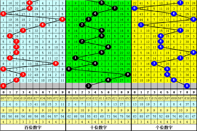 3、在以上0-9号码频次中,号码奇偶比为25:28,大小比为30:23,本期预计百位开出小号,参考号码0。