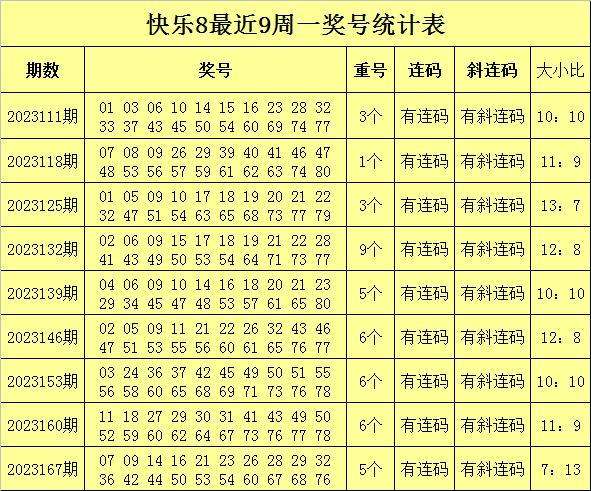 福彩快乐8第2023167期(上周一)奖号回顾:07 09 14 16 21 23 26 28 29 32 36 42 44 50 53 54 60 67 68 76,其中大小比为9:11,包含5个重号29、50、60、67、76,包含连码28 29、53 54、67 68。