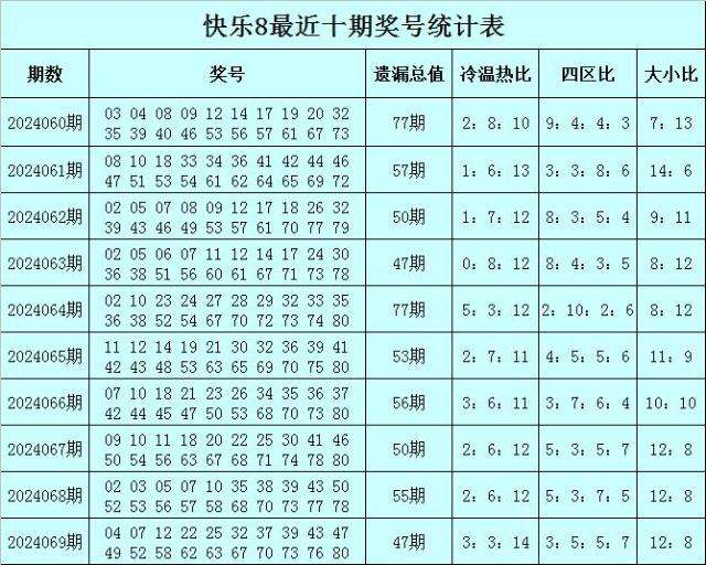 福彩快乐8第2024069期开奖回顾:04 07 12 22 25 32 37 39 43 47 49 52 58 62 63 67 70 73 76 80,其中奖号遗漏总值为47,冷温热码比为3:3:14,四区比为3:5:5:7。
