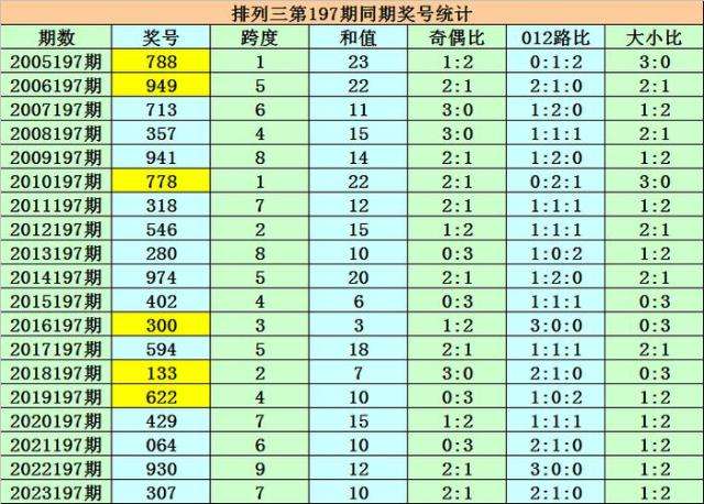 上期回顾:排列三第2023197期奖号为307,组选类型为组六,奖号大小比为1:2,012路比为2:1:0,奇偶比为2:1。