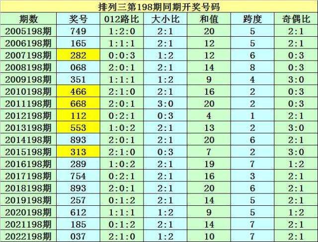 本期为排列三第2023198期开奖,开奖日期为:2023年7月27日,历史上排列三第198期已开出了18次奖号,历年同期开出号码分别为:749-165-282-068-351-466-668-112-553-893-313-289-754-893-257-612-185-037。