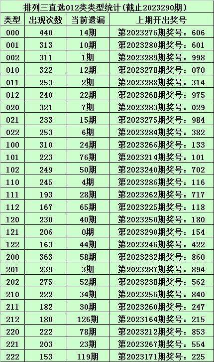 上期回顾:体彩排列三第2023290期开出奖号:154,其012路比为0:2:1,奖号012路类型为:121。