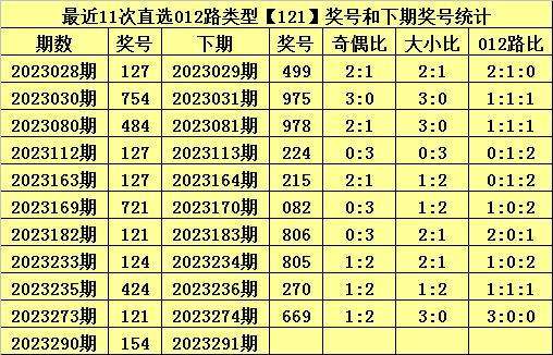 前10次直选121组合出现之后,其下期奖号分别为:499、975、978、224、215、082、806、805、270、669,其中奖号奇偶总比例为12:18,012路总比例为12:6:12,大小总比例为18:12。