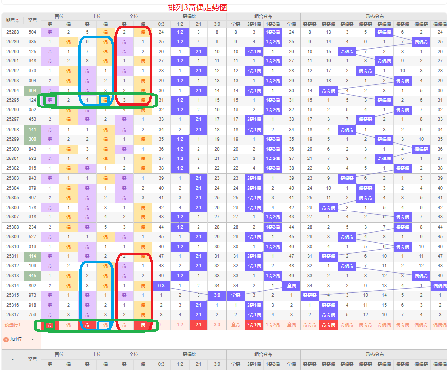 上一期的奇偶比为2:1,俩奇的号码组合,从近五期的奇偶数出现情况看,奇数出8次,偶数出现7次,奇数号码出现较平均,本期要侧重两奇的号码组合,侧重奇奇偶或奇偶偶的号码组合,根据奇偶组合形态可做五码定位13579/13579/02468或13579/02468/02468