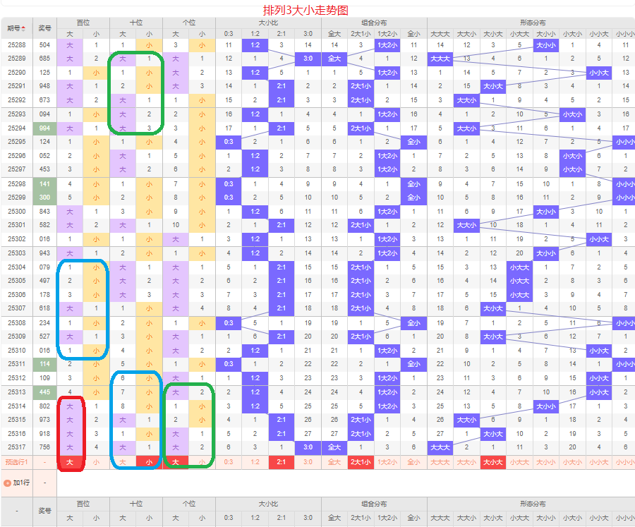 上一期大小比为3:0,全大的号码组合,近五期大号出9次,小号出6次,大号码出现较多,上一期是两大的号码组合,本期侧重两大的号码组合,百位侧重大号码,十位侧重小号码,个位侧重大号码,侧重大小大或者大小小的号码组合,根据大小形态五码定位56789/01234/56789或者56789/01234/01234