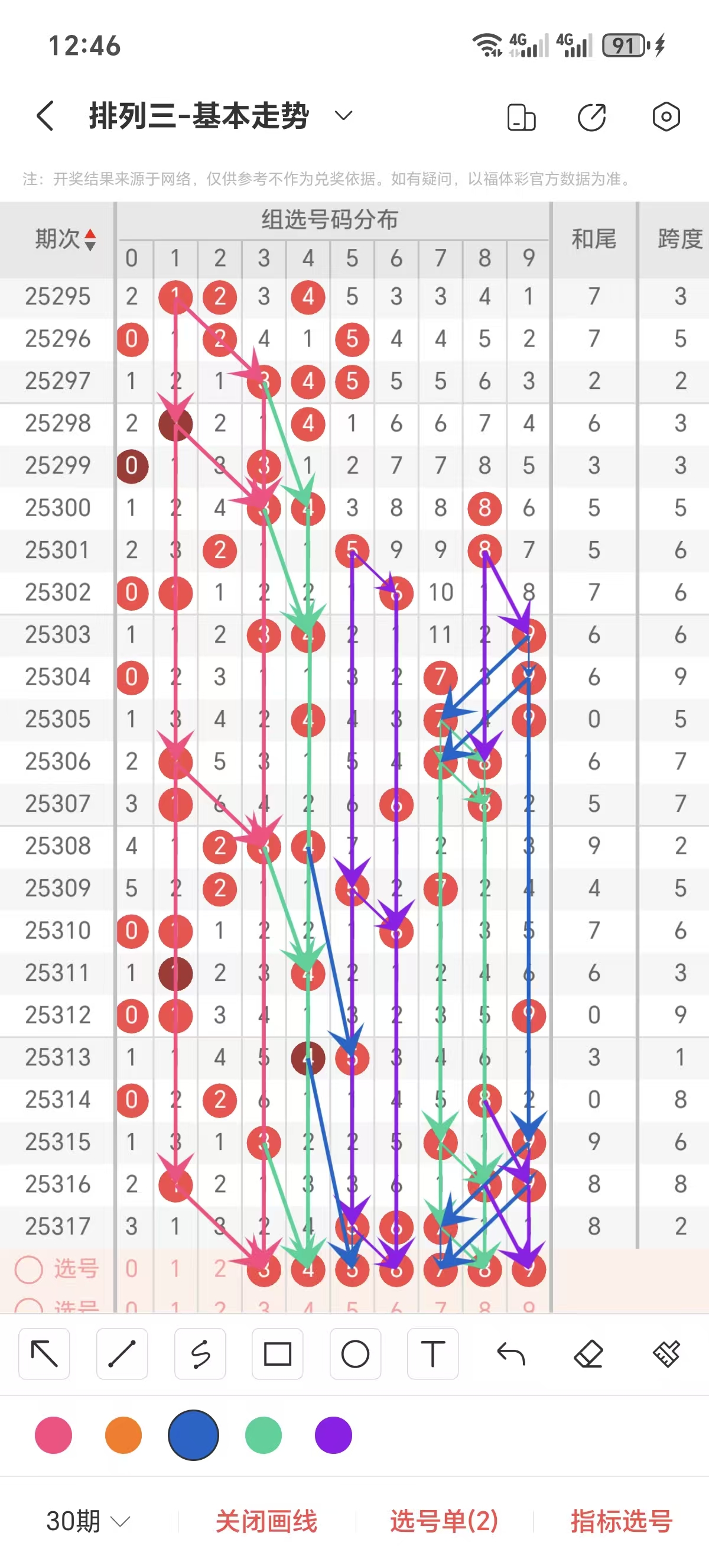 通常情况下在五期之内重复一个跨度的概率较高,近五期重复了8的跨度,近五期跨度为1/8/6/8/2,近期2路的跨度较热,本期要侧重4/5/6跨为主的号码组合。选择好跨度就可以从跨度方面选择相应的双胆码组合,双胆码的选取要根据近期和历史的走势进一步的分析选取。