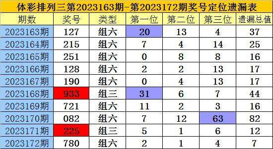 开奖回顾:排列三第2023172期奖号为:780,各位号码遗漏值分别为2、1、4,遗漏总值为7。