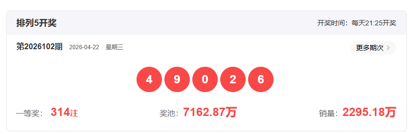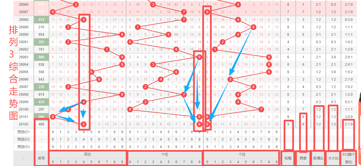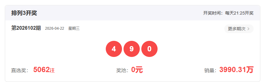 体彩排列3第2026102开奖号码490,形态为组六,奇偶比1:2,和值13,跨度9,大小比1:2,【012】路个数比2:1:0。
