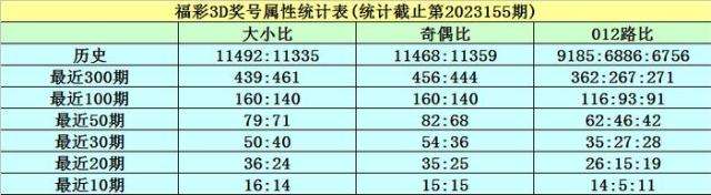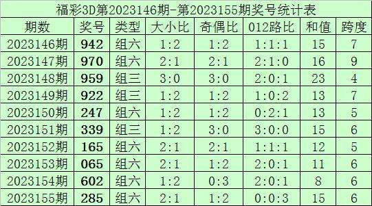 开奖回顾:福彩3D第2023155期奖号为285,其中奖号大小比为2:1,奇偶比为1:2,012路比为0:0:3,和值为15,跨度为6。