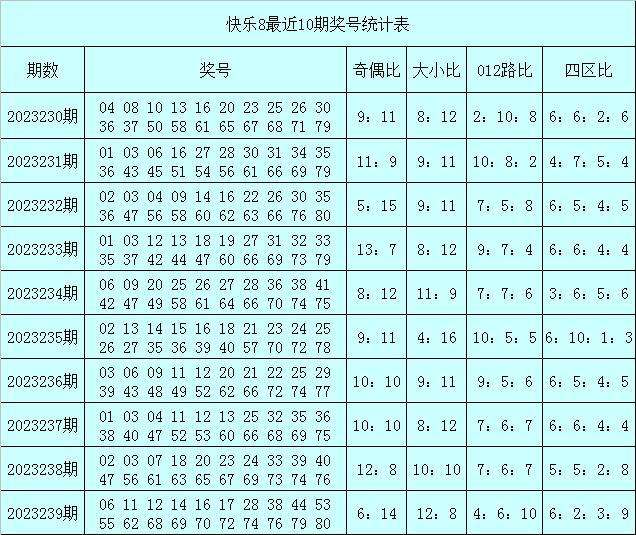 福彩快乐8第2023239期开出奖号:06 11 12 14 16 17 28 38 44 53 55 62 68 69 70 72 74 76 79 80,其中奖号奇偶比为6:14,大小比为12:8,012路比为4:6:10,四区比为6:2:3:9。