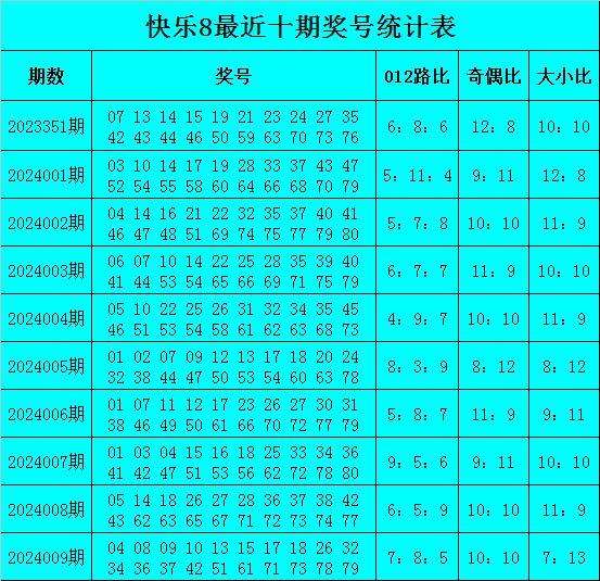 福彩快乐8第2024009期开奖回顾:04 08 09 10 13 15 17 18 26 32 34 36 37 42 51 61 71 73 78 79,其中奖号012路比为7:8:5,1路号码表现活跃。