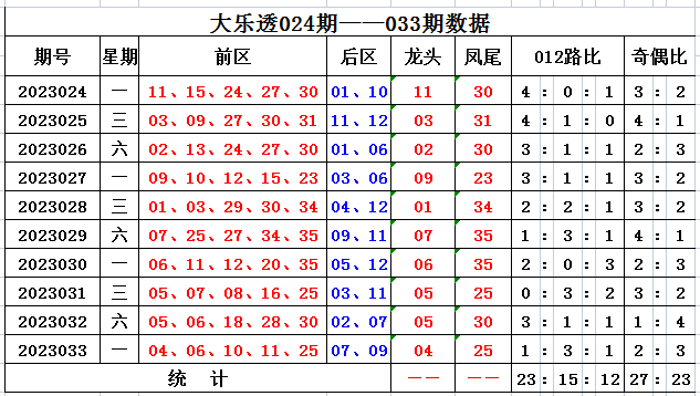 上期回顾,大乐透第2023033开奖,本期奖号:前区04 06 10 11 25;后区07 09,当期前区号码大小比为1:4,三区比4:0:1,奇偶比2:3。前区开出连号10 11,开出重号06。