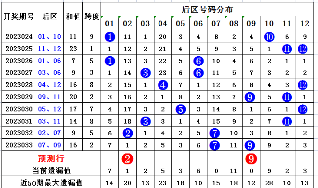 后区冷热分析(最近5期未开出的号码为冷号):上期大乐透后区开出号码07 09,近十期开出冷冷形态2次,冷热形态4次,热冷形态0次,热热形态4次。本期推荐热热态开出,参考后区号码02 09。