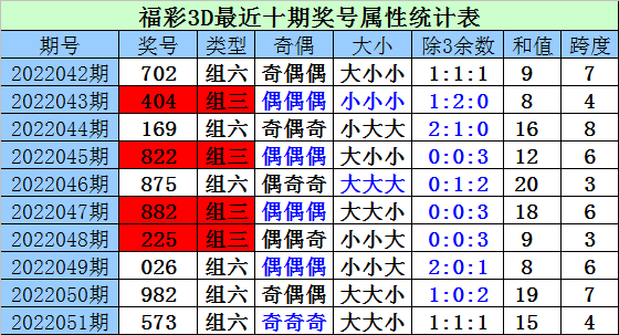 上期回顾:上期开奖奖号为573,类型:组六,奇奇奇,大大小,1:1:1,和值15,跨度4。