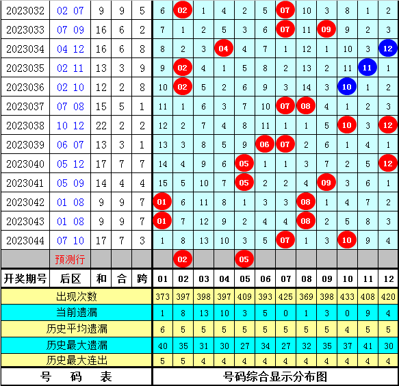 大乐透历年同期第045期后区尾数奇偶比为17:15,最近5年尾数奇偶比为8:2,后区尾数大小比为14:18,最近5年尾数大小比为6:4,本期后区注意号码02、05、07、11、12,后区两码关注02、05。