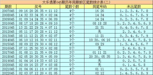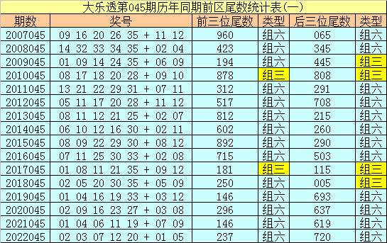 在大乐透第045期历年同期奖号中,前区后三位尾数出号频次分别为:尾数0出现9个,尾数5出现7个,尾数1、2、6出现5个,尾数3、9出现4个,尾数4、7、8出现3个。其中尾数数字三类型豹子、组三、组六次数比为0:4:12,今年同期后三位尾数类型参考组六;