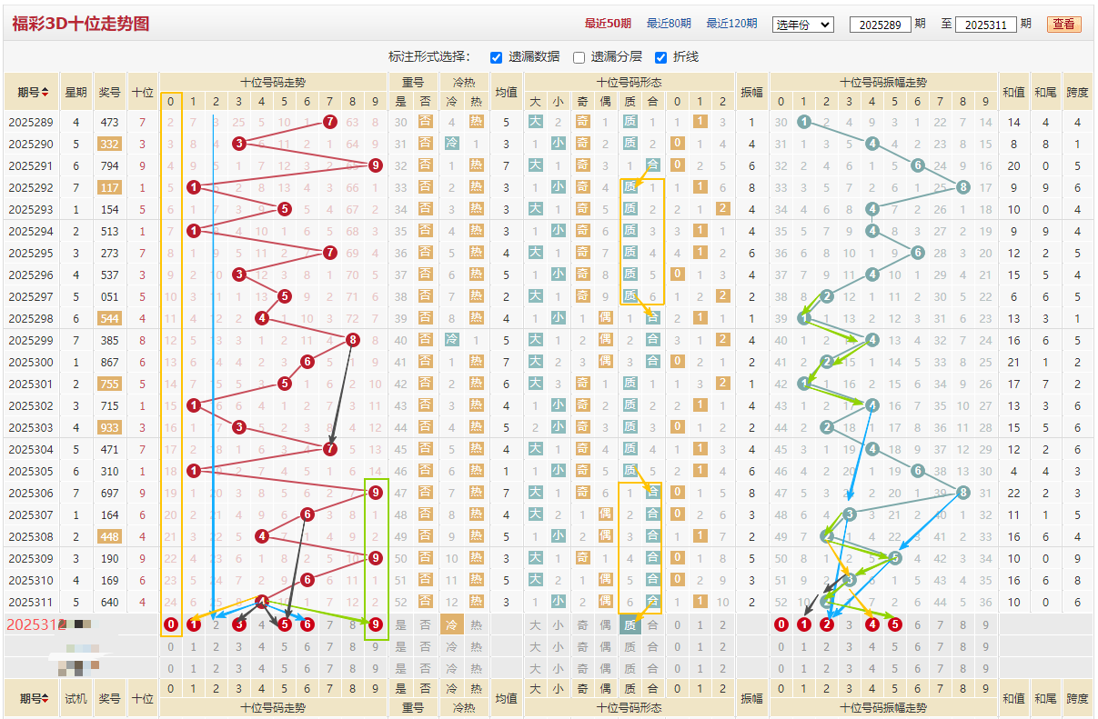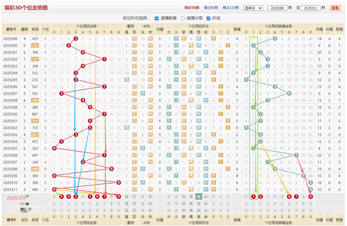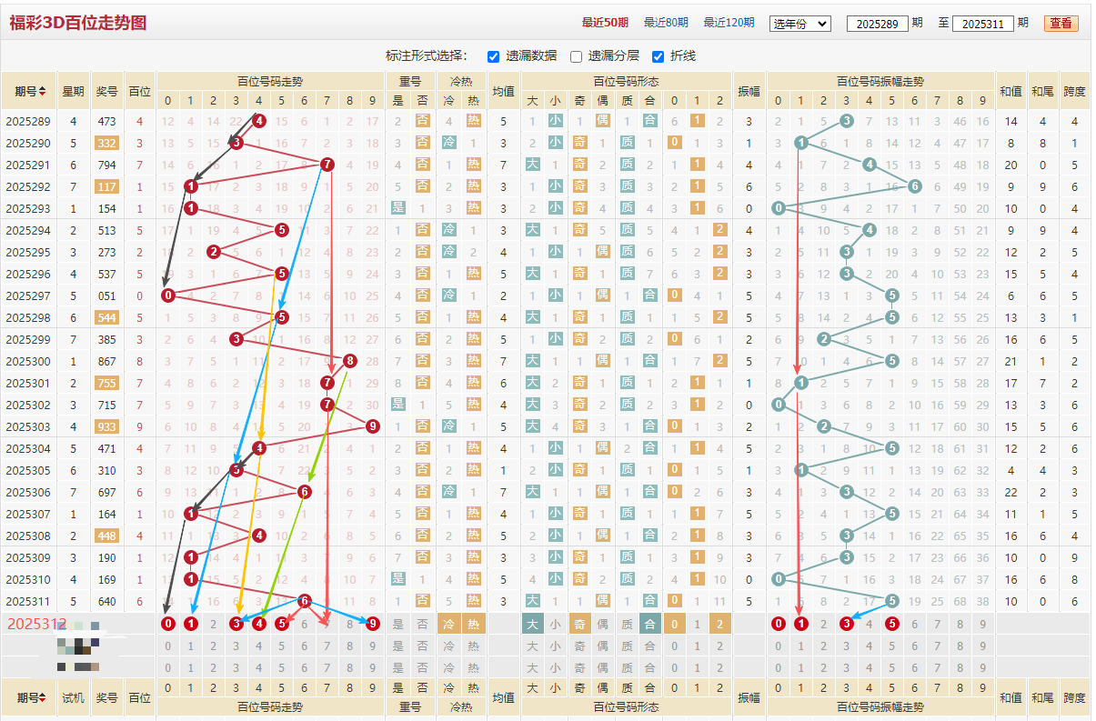 百位近期走势:5/3/8/7/7/9/4/3/6/1/4/1/1/6,质数占优开出8期,本期个人则重点看合数回补,2路球遗漏11期没开可以关注,如上图振幅红色线1/1/1隔10期下来对应数字57,303-306期2531和309-312期3053对应数字39,看左边绿色线8/6/4,蓝色线7/5/3/1,黄色线5/4/3,红色线7/7/7都是等隔走势,综合上述百位推荐:013459