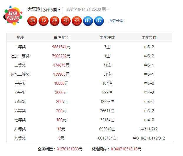 大乐透第2024119期开奖,前区奖号:06、12、28、30、33;后区奖号:02、07。其中前区奖号012路比为4:1:0,后区开出2路+1路号码。