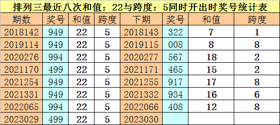 体彩排列三最近八次同时出现和值:22与跨度:5的奖号分别为:949、949、994、499、949、949、994、499,前七次下期开出奖号分别为:322、008、567、465、917、934、408,详见下表: