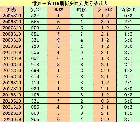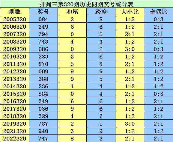 从2004年至今排列三已开出6740期奖号了,本期为排列三2023年第320期开奖,历史同期已出现17次奖号: