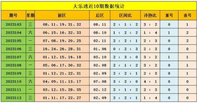 上期回顾:大乐透第2023112期奖号为:前区01、11、17、22、27,后区02、09,前区奖号三区比为2:2:1,开出0枚重号,开出0组连号。后区开出小大组合02、09
