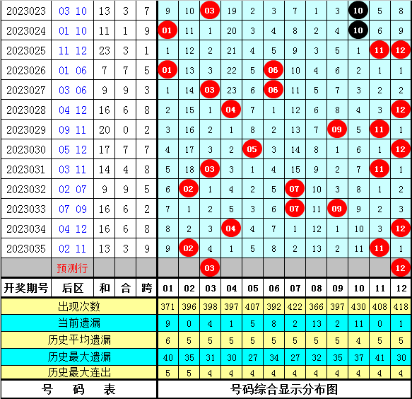 9。在历史同期奖号中,后区号码08出现6次;01 07出现4次;02 03出现3次;05 06 09 10 12出现2次;04 11出现1次。