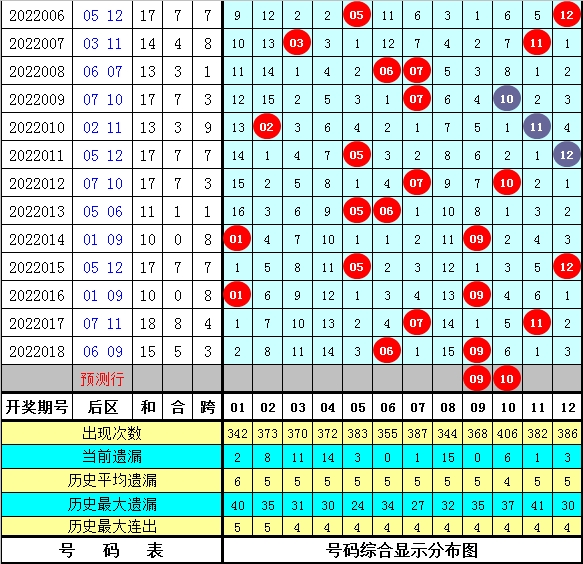 上期后区奖号:06和09,最近9期后区号码012路比为7:5:6,,奇偶比为12:6,本期后区参考号码01、02、04、09、10,后区两码关注09和10。