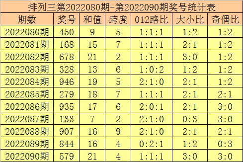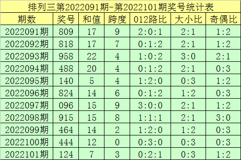开奖回顾:排列三第2022101期奖号开出:124,组选类型:组六,大小比为0:3,奇偶比为1:2,和值为7,跨度为3。