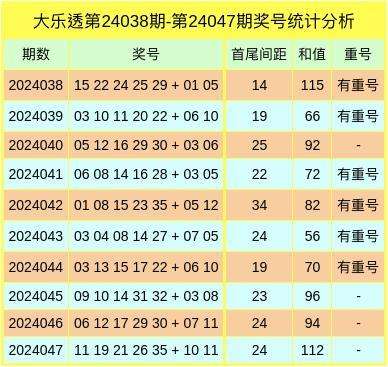 上期前区和值为112,无重号,无连号,首尾间距为24。